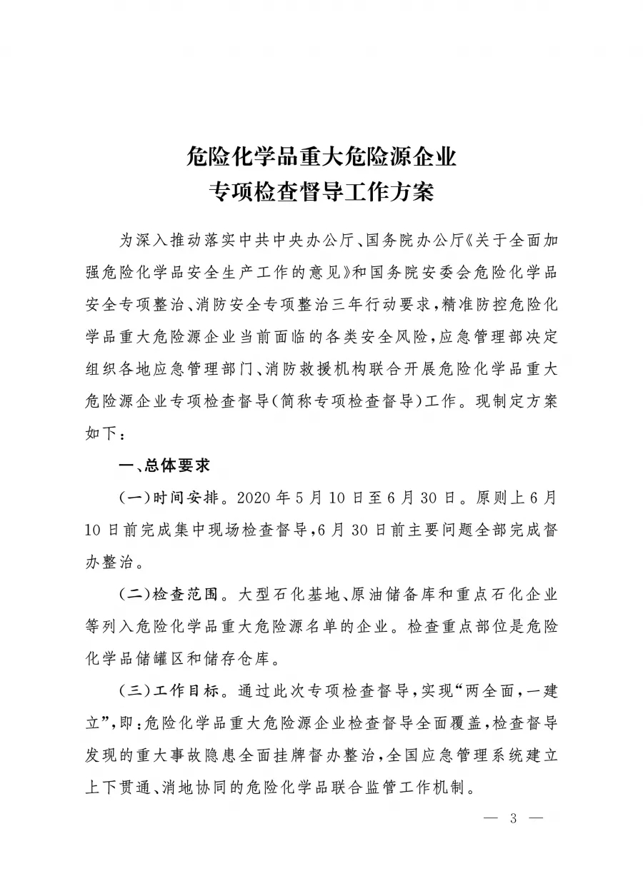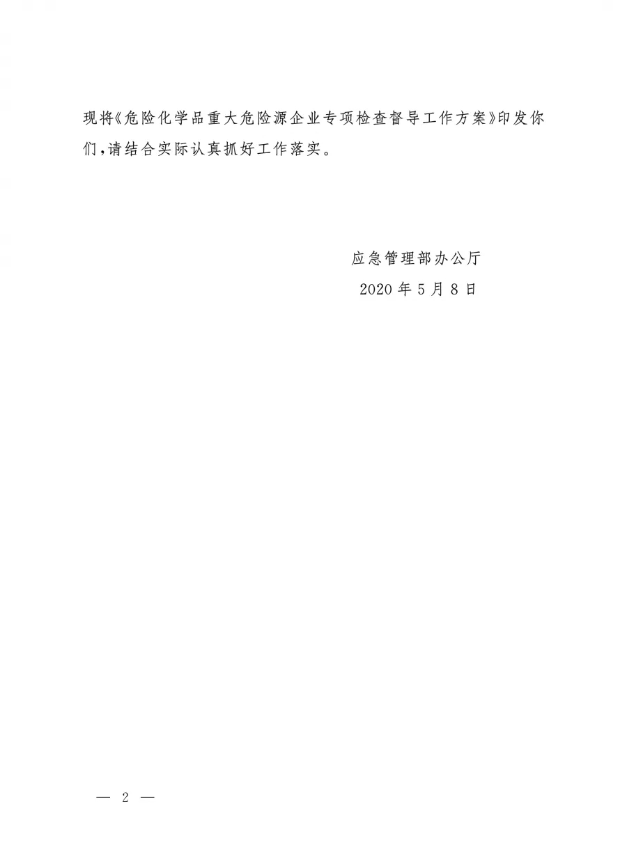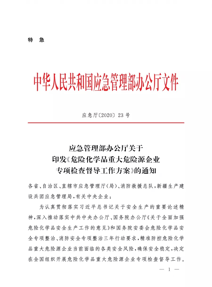 | 應(yīng)急廳〔2020〕23號 危險(xiǎn)化學(xué)品重大危險(xiǎn)源企業(yè)專項(xiàng)檢查督導(dǎo)工作方案 |